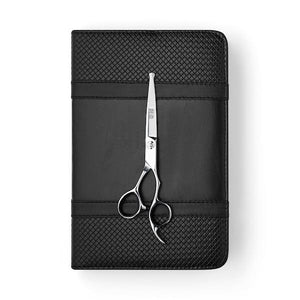 The offset handle in the grooming scissors brings the thumb into a natural position for cutting and the solid finger rest can never come loose and get lost. The tension system creates an extra smooth feel to the scissors.