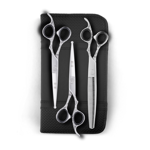 Sozu Floral Ball Tip cutting scissor and thinner triple set is made from 440C Steel and have a pooch friendly protective ball tip at the end of the shear to make sure no animals are harmed in the grooming process.